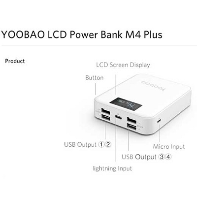 Внешний аккумулятор с повышенной емкостью Yoobao Master LCD Power Bank M4 Plus 10000 mAh. Это портативное зарядное устройство избавит Вас от проблемы не вовремя разрядившегося электронного девайса при отсутствии доступа к электросети: все, что необходимо для заряда, это штатный USB-кабель Вашего смартфона, планшета или иного устройства, поддерживающего зарядку от USB. Небольшие габариты (99×76×23, вес 265 г) и впечатляющая емкость батареи превращают Master LCD Power Bank M4 Plus в оптимальный вариант, особенно для путешественников и любителей отдыха на природе.