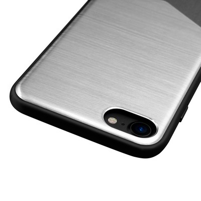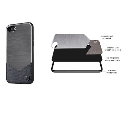 Задняя часть чехла выполнена из поликарбоната. Это противоударный пластик, который выдерживает любые нагрузки. Его невозможно разбить и очень сложно сломать. Он имеет матовую поверхность черного цвета.Наружный слой задней крышки состоит из металлической вкладки в сочетании с кожей. Смотрится дорого и эффектно.