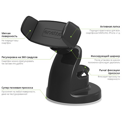 — Надежное крепление автодержателя практически на любую поверхность за счет супер гелиевой присоски;
