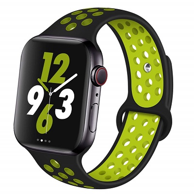 Спортивный ремешок Nike из фторэластомера для часов Apple Watch Series 4 44мм, черный/салатовый.