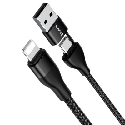 Baseus 2-in-1 Dual Output имеет алюминиевый внутренний каркас, который не позволяет кабелю спутываться при его внушительной длине (1 м). Прочная тканая нейлоновая оплетка не склонная к разрывам и переломам. Такой аксессуар поистине является эталоном качества и надежности. На одном конце аксессуар имеет разъем Lightning, а с другого конца он оборудован коннектором USB-C и дополнительной сменной насадкой USB Output. Такая конструкция позволяет использовать кабель с широким спектром мобильных гаджетов.