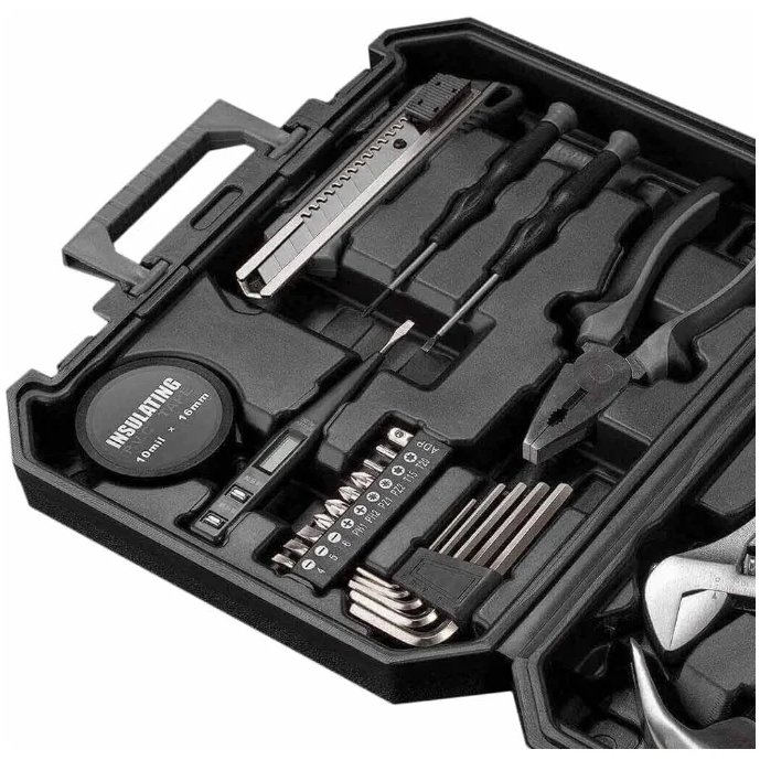 Набор инструментов Jiuxun tools Daily Life Kit 60 in 1 от Xiaomi станет отличным подспорьем как в мелком домашнем ремонте, так и при сборке мебели или обслуживании коммуникаций. Все изделия выполнены из высококачественной углеродистой стали с высокотемпературной закалкой и имеют специальное антикоррозийное покрытие.
