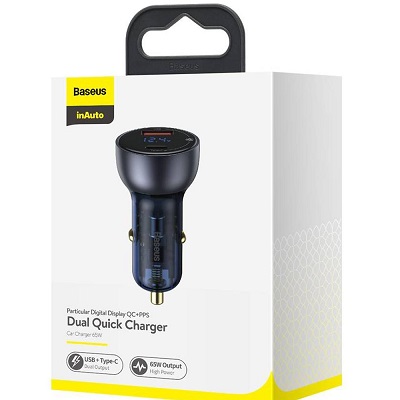 Baseus Particular Digital Display QC+PPS Dual Quick Charger C+U 65W (CCKX-C0G) – универсальное мощное зарядное USB-устройство, работающее от автомобильного прикуривателя 12-24 В и позволяющее быстро заряжать сразу два устройства.