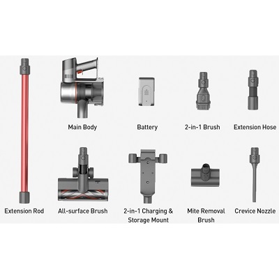 - Комплектация: Беспроводной пылесос, основная универсальная насадка, анти-клещ насадка, насадка 2-в-1, узкая насадка для щелей, трубка-удлинитель, гофрированная гибкая трубка, настенный держатель для зарядки, адаптер питания, батарея, крепежные детали для держателя