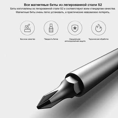 - Материал корпуса Отвертки: алюминий. Биты: легированная сталь S2