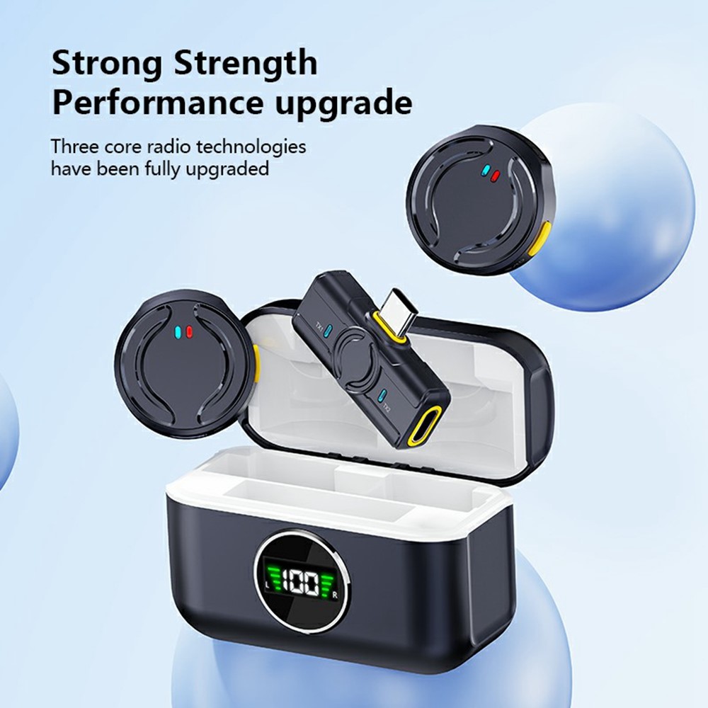 - Двойные беспроводные микрофоны — два петличных передатчика для записи диалогов, интервью или стерео-эффекта; комплект с приемником Type-C и зарядным чехлом для удобного хранения и подзарядки.